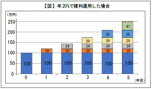 単利で運用した場合、同じ年利20%だとしても、5年後にも元本は100万円のまま。元本が変わりませんから利息も20万円です。複利では41万円ですから倍以上になります。こうしたメリットを、リスクを分散しながら獲得することを考えてみてください。